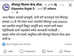 विद्युत् प्राधिकरण कार्यालय मौलापुरका अनुसार हावाहुरीसहितको वर्षा र चट्याङ्का कारण चन्द्रनिगाहपुरमा १३२ केभी लाइनमा समस्या आएको हो । उक्त समस्याका कारण रौतहटको मौलापुर लगायत अन्य ठाउँको लाइन अवरुद्ध भएको थियो । विहिबार विहान ७ बजे देखी चन्द्रनिगाहपुर र हर्षाहा सम्म लाईन सुचारू गरिएको मौलापुर वितरण शाखाका कर्मचारी महेश कामतीले जनकारी दिनु भयो ।