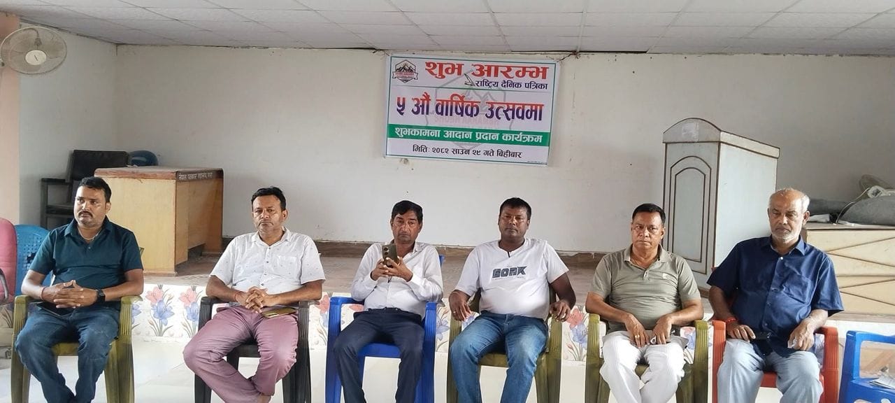 बारा, कलैया — शुभ आरम्भ राष्ट्रिय दैनिक पत्रिकाको पाँचौं वार्षिकोत्सवको अवसरमा आज कलैयामा विशेष शुभकामना आदान–प्रदान कार्यक्रम सम्पन्न भएको छ। कार्यक्रममा स्थानीय पत्रकार, समाजसेवी, व्यवसायी, राजनीतिक दलका प्रतिनिधि र शुभेच्छुकहरूको उल्लेखनीय उपस्थिति रहेको थियो।