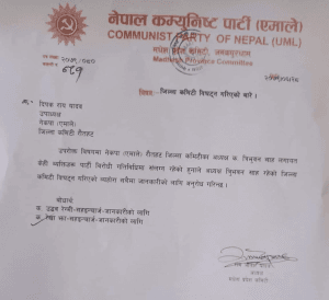 एमालेको मधेश प्रदेश कमिटीका अध्यक्ष रामऔतार यादवले शुक्रबार एक विज्ञप्ति जारी गरी जिल्ला कमिटी अध्यक्ष त्रिभुवन साह लगायतका केही व्यक्तिहरु पार्टीविरोधी गतिविधिमा लागेकाले जिल्ला कमिटी विघटन गरेको बताएका छन् ।