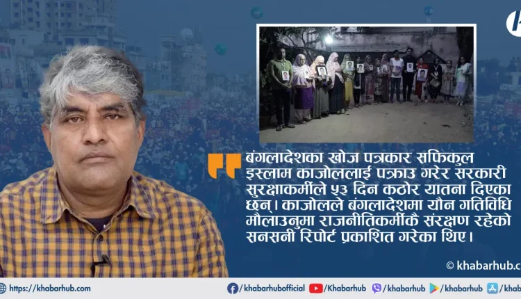 ‘मलाई चिडियाघरको जनावरको जस्तो व्यवहार गरियो । मेरो आँखामा पट्टी बाँधिएको थियो । पछाडिबाट मेरो हतकडी फुकाएको खाना खानका लागि मात्र हो’ काजोल नामले परिचित बङ्गलादेशका पत्रकार सफिकुल इस्लाम काजोलले आफूलाई ५३ दिनको कठोर यातना सहित गायब बनाइएको समय सम्झँदै भनेका छन् ।