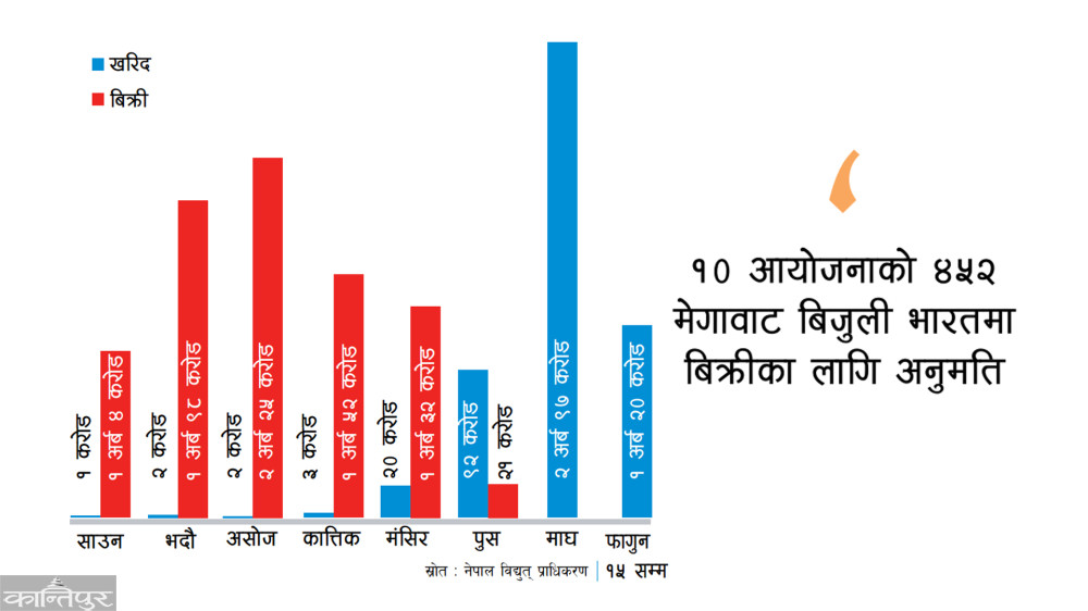 प्राधिकरणका प्रवक्ता सुरेशबहादुर भट्टराईका अनुसार गत साउनदेखि पुससम्ममा बढी भएको बिजुली भारतीय ऊर्जा विनिमय (आईएक्स) मा बिक्री गरिएको हो । प्राधिकरणले साउनमा करिब १ अर्ब ४ करोड रुपैयाँको बिजुली बेचेको थियो । भदौमा करिब १ अर्ब ९८ करोड, असोजमा सबैभन्दा धेरै करिब २ अर्ब २५ करोड, कात्तिकमा करिब १ अर्ब ५२ करोड र मंसिरमा करिब १ अर्ब ३२ करोड रुपैयाँ बराबरको बिजुली बिक्री गरेको छ । यस्तै पुसमा करिब २१ करोड रुपैयाँको बिजुली बिक्री भएको छ । सात महिनामा १० लाख ७८ हजार ८४८ गिगावाट घण्टा बिजुली भारत निर्यात भएको छ । प्राधिकरणले देशभित्रको मागअनुसार आफ्नो उत्पादन हुन छाडेपछि पुस पहिलो सातादेखि विद्युत् निर्यात बन्द गरेको छ ।