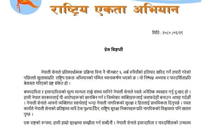 नेपाली सेनाले प्रतिस्पर्धात्मक प्रक्रिया विना नै चीनबाट हतियार खरिन गर्ने तयारीप्रति अभियानकाे ध्यानाकर्षण