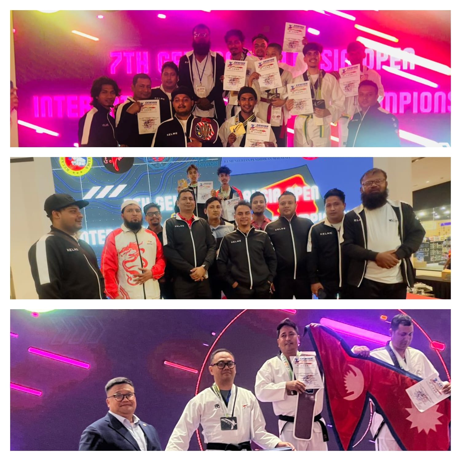 नेपालबाट मलेसियामा पुगेका १६ जनाको जम्बो टोलिमा १२ खेलाडी सहित टिम म्यानेजर आशिष घिमिरे, रेफ्री उमर खान र प्रशिक्षक द्वय रोशन खान र कमल भट्टराई प्रशिक्षक रहेका थिए । रोशन खान तेक्वान्दो चितवन जिल्लाको प्रशिक्षक पनि हुन ।