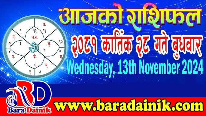 आजको राशिफल बि.सं.२०८१ कार्तिक २८ गते बुधबार ई.सं.२०२४ नोभेम्बर १३ नेपाल सम्बत ११४५ कछलाथ्व द्वादशी, कालयुक्त नाम संवत्सर सूर्य दक्षिणायनं शरद ऋतु, कार्तिक शुक्ल द्वादशी, चन्द्रमा मीन राशिमा, रेवती नक्षत्र, वज्र योग, बालव करण । आज नेपालमा सूर्योदय बिहान ०६: २३ बजे, सूर्यास्त साँझ ०५: १२ बजे हुनेछ । आज जन्म लिने बच्चा मीन राशीको हुनेछ ।